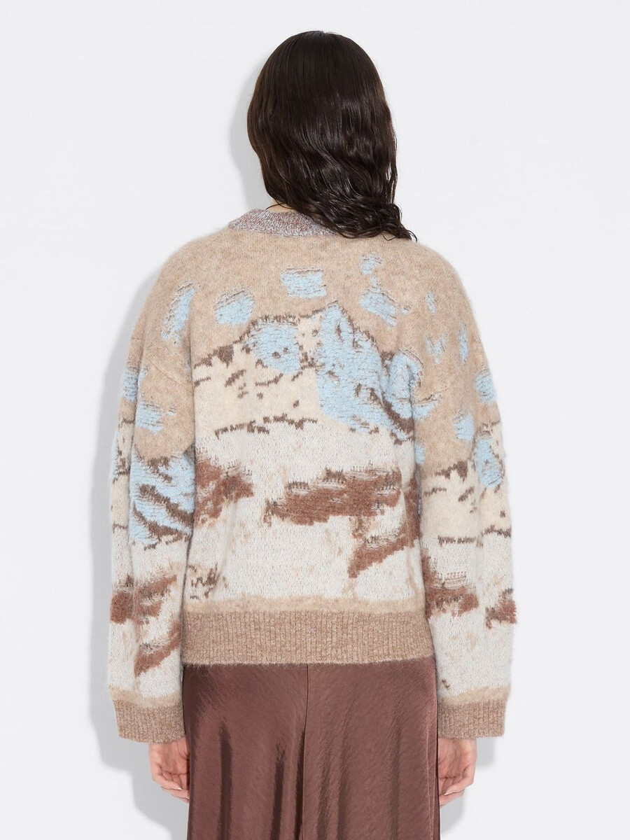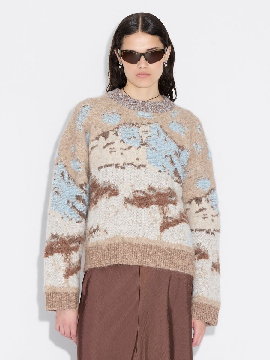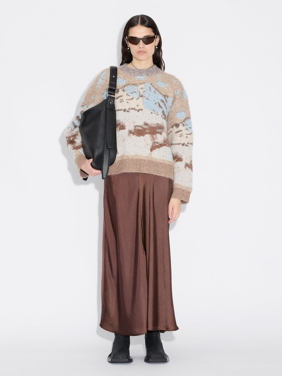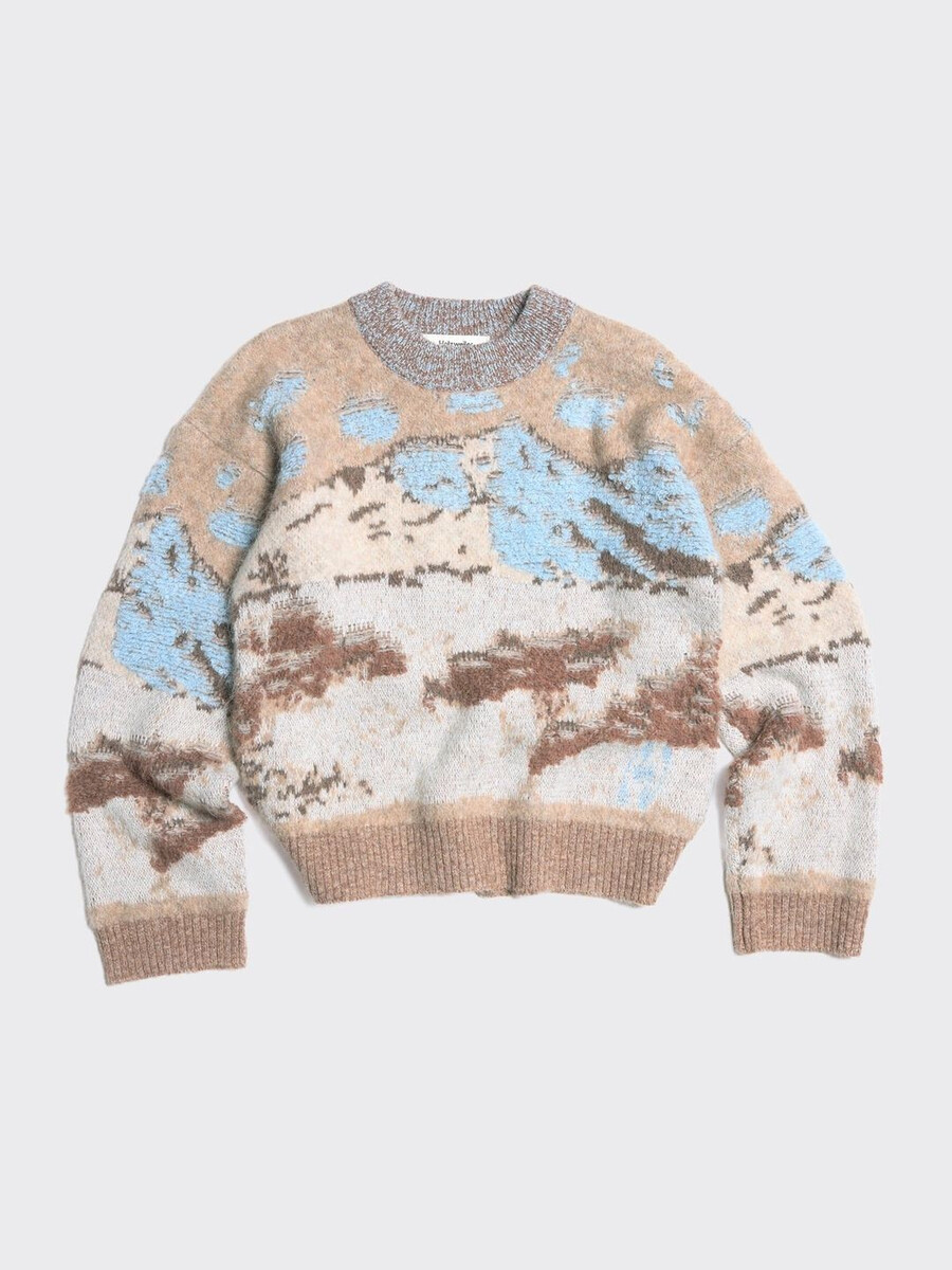 The Alva Landscape sweater is made from a soft alpaca-blend in a jacquard knit depicting a snowy mountaintop. A cosy oversized style, it has a crew neck and insulating ribbed edges.