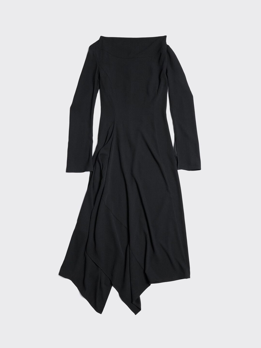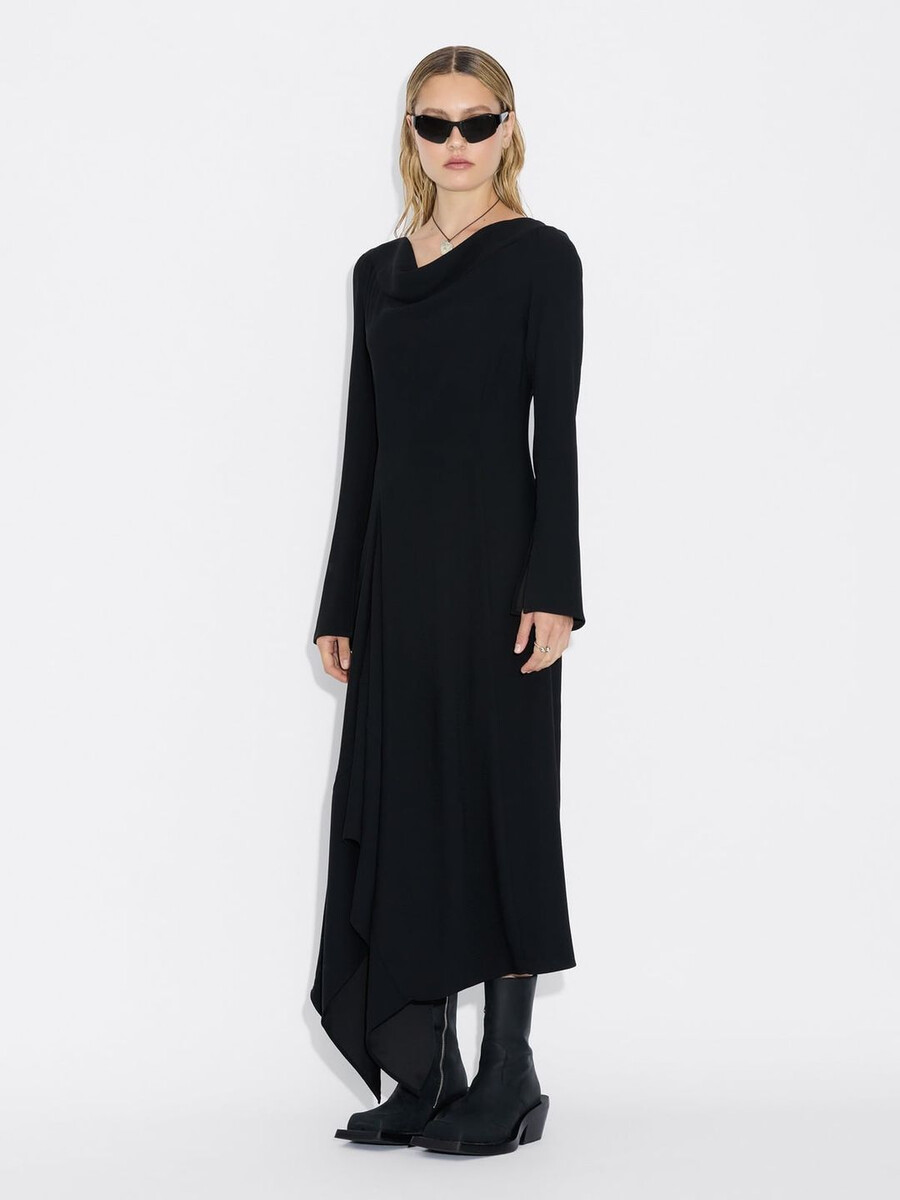 Defined by an asymmetric hemline and draped detailing, the Beauty dress is a modern update on a classic silhouette. It’s made from a lightweight fabric, and it has long sleeves and a gathered waist.