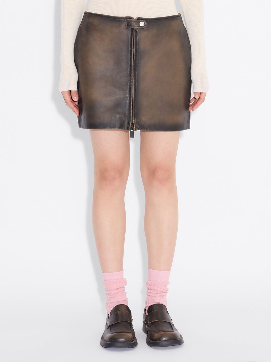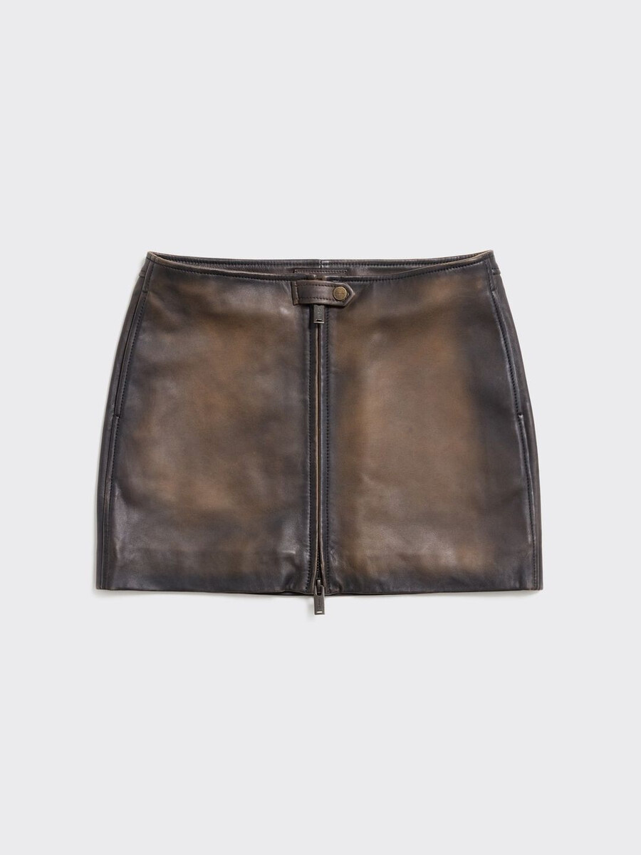 Made from leather with a faded finish, the Cia Leather skirt sits at a mid-rise waist and has a mini-length hem. Securing with a front zip fastening, it has snap fastenings at the waist and can be styled with the matching Cia leather jacket.