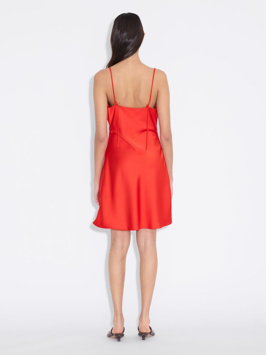 Hanging from spaghetti straps, the Eila short dress has a draped neckline, a lightly fitted waist and a straight hem.