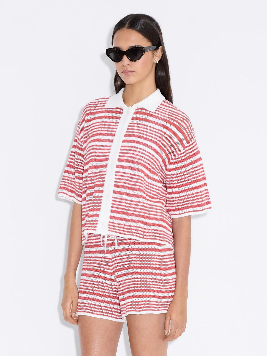 The Kelp Striped shirt is made from pure organic cotton in a crochet knit. A short-sleeve style with an oversized fit, it has a classic collar and a front button placket. Style with the matching Kelp Striped shorts.