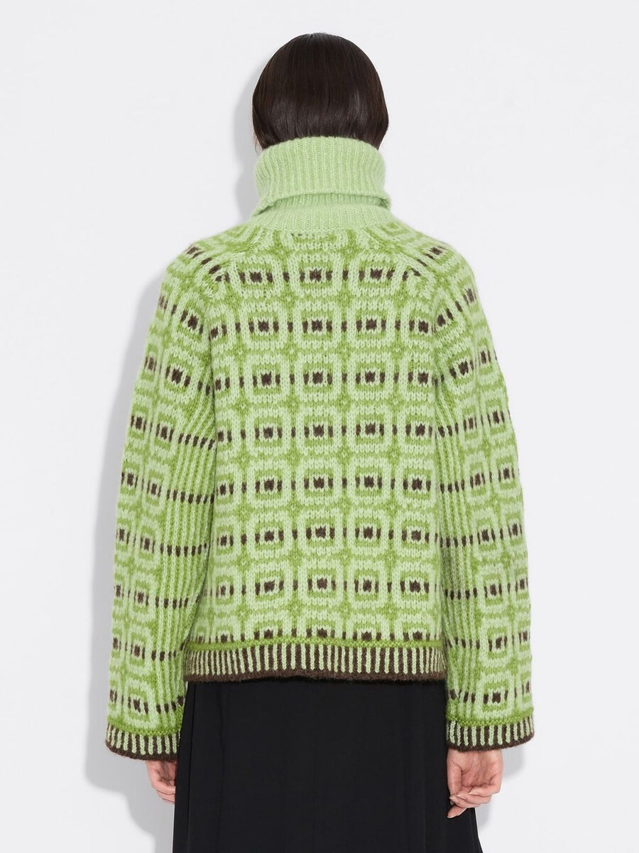 The Norwegian Wool turtleneck has been designed in collaboration with Skappel. Made from soft Norwegian lambswool with an all-over intarsia pattern, it’s a boxy silhouette with a relaxed fit.