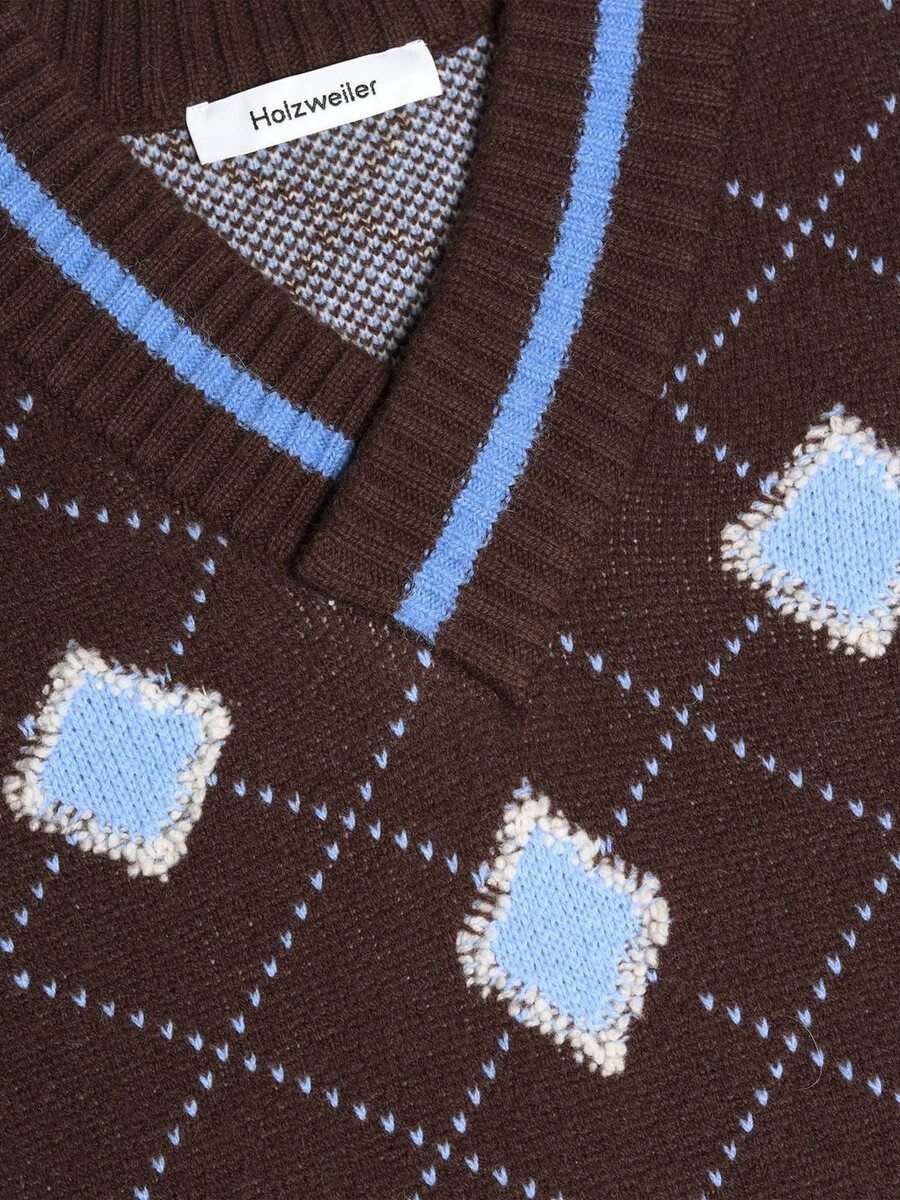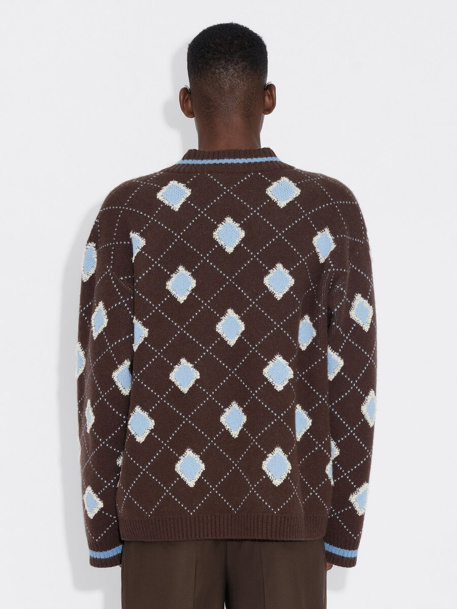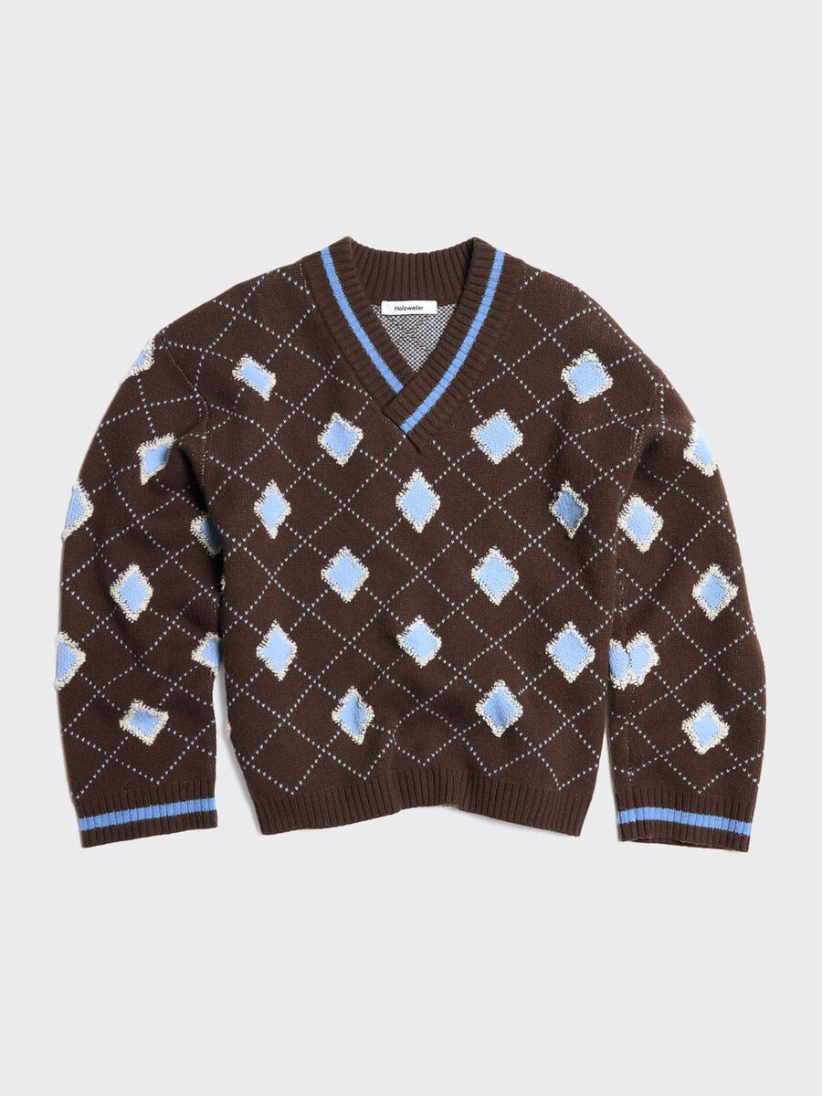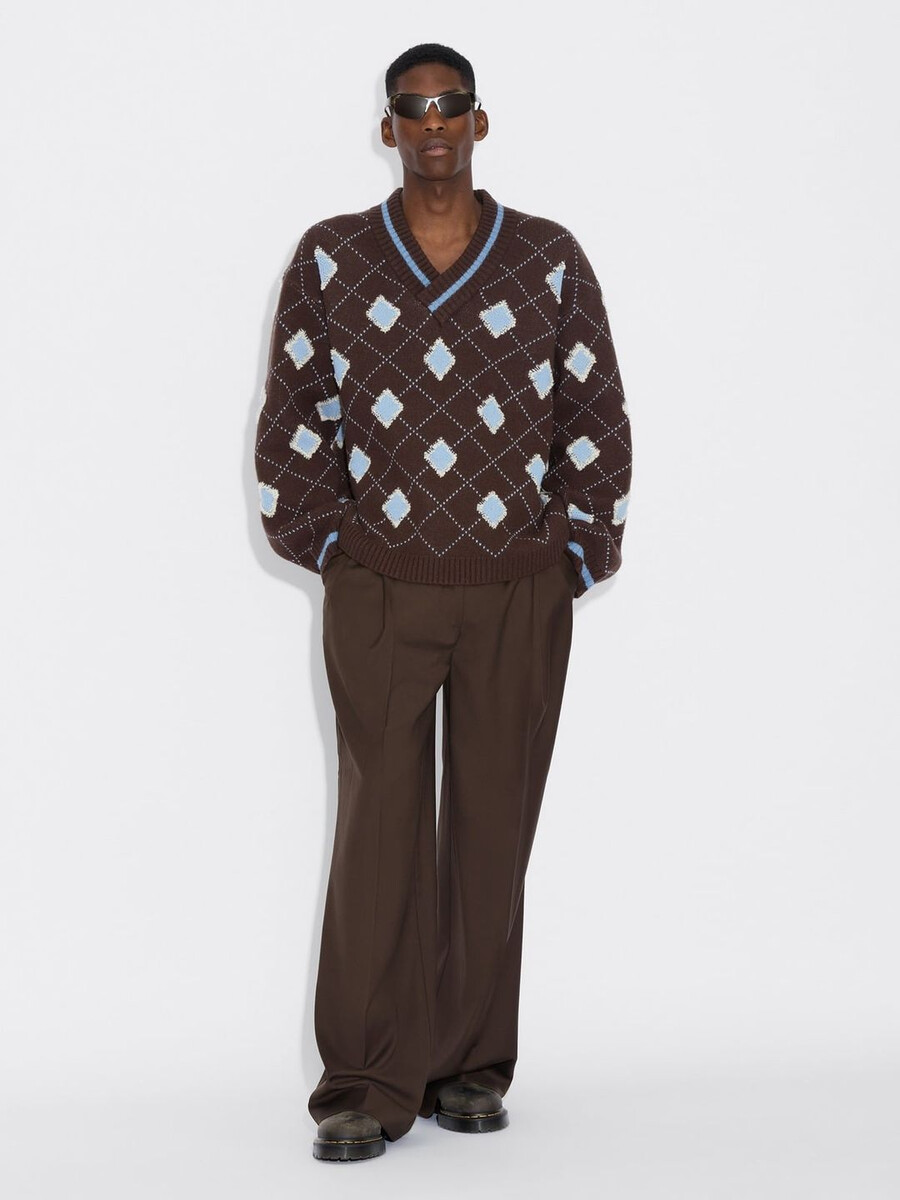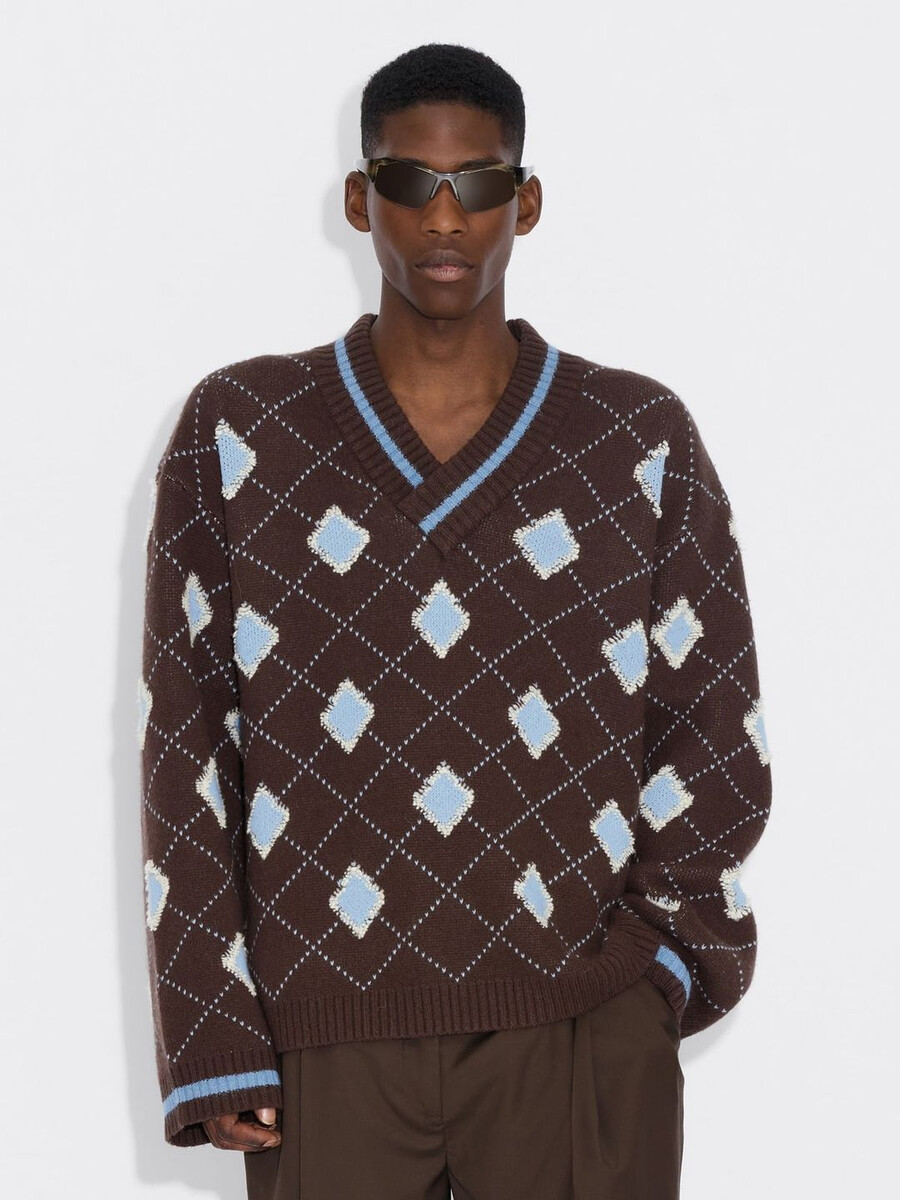 The Palomar V-neck sweater is made from a pure wool knit with a classic Argyle pattern. An oversized fit, it’s finished with insulating ribbed edges.