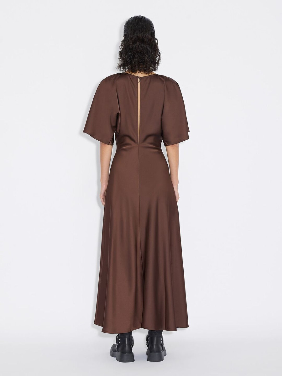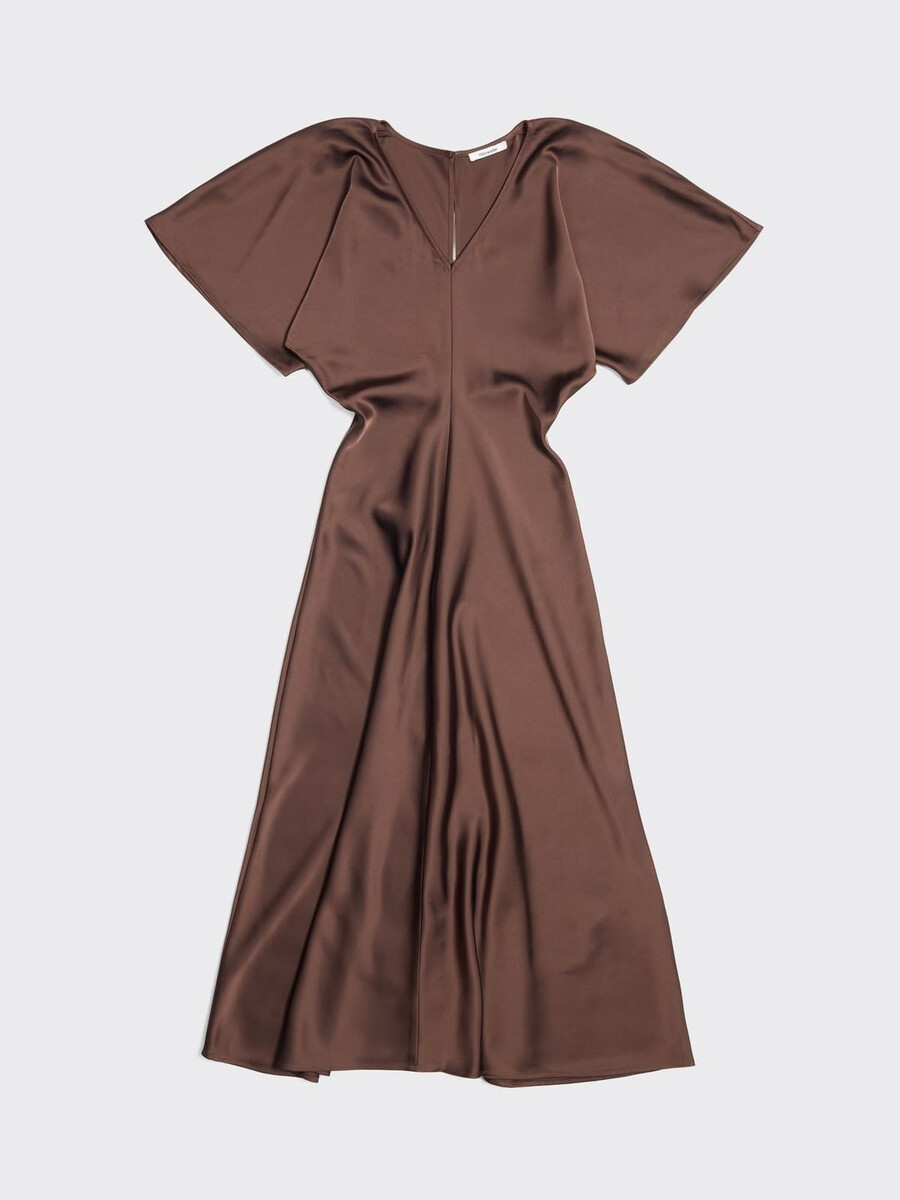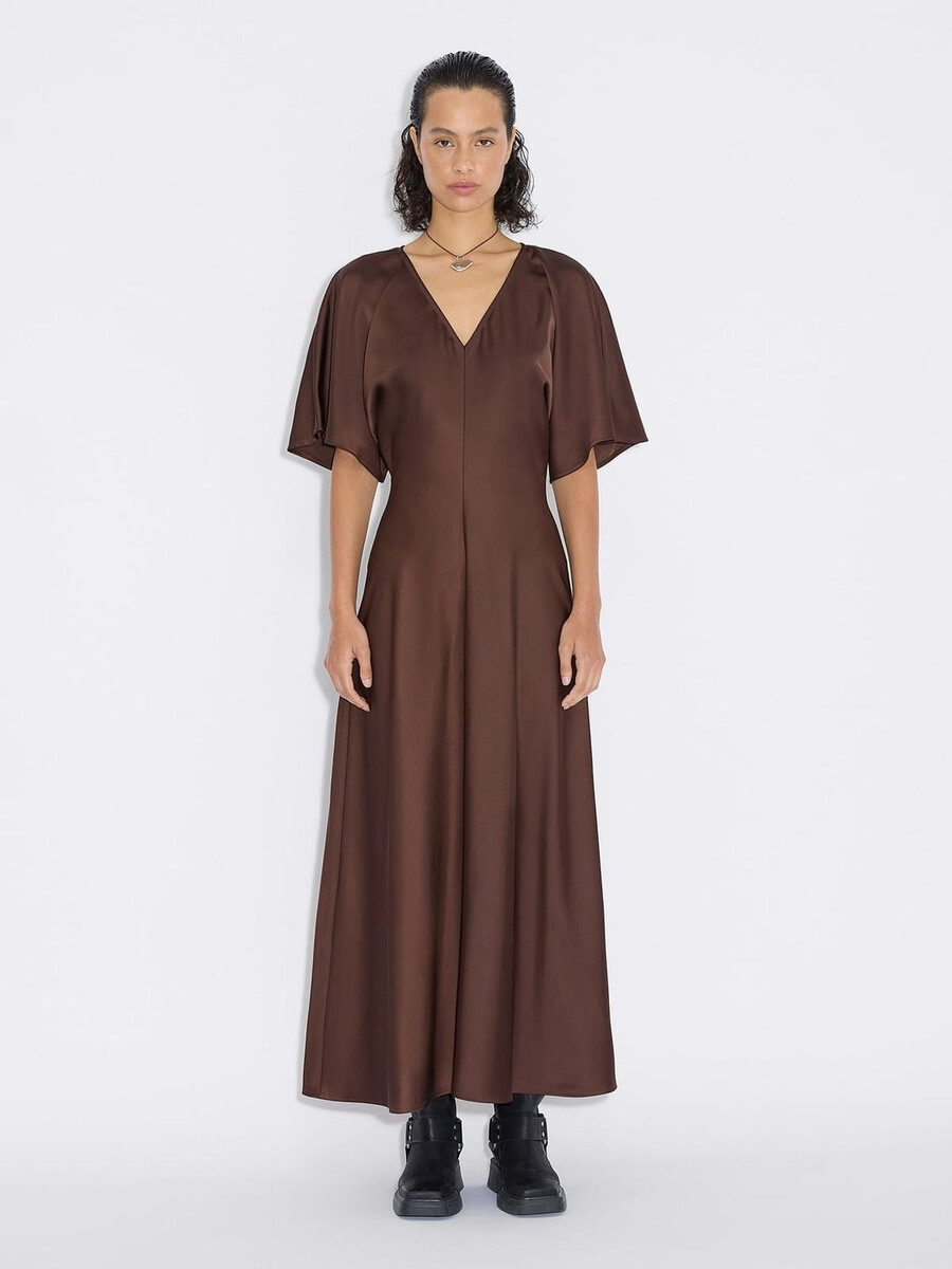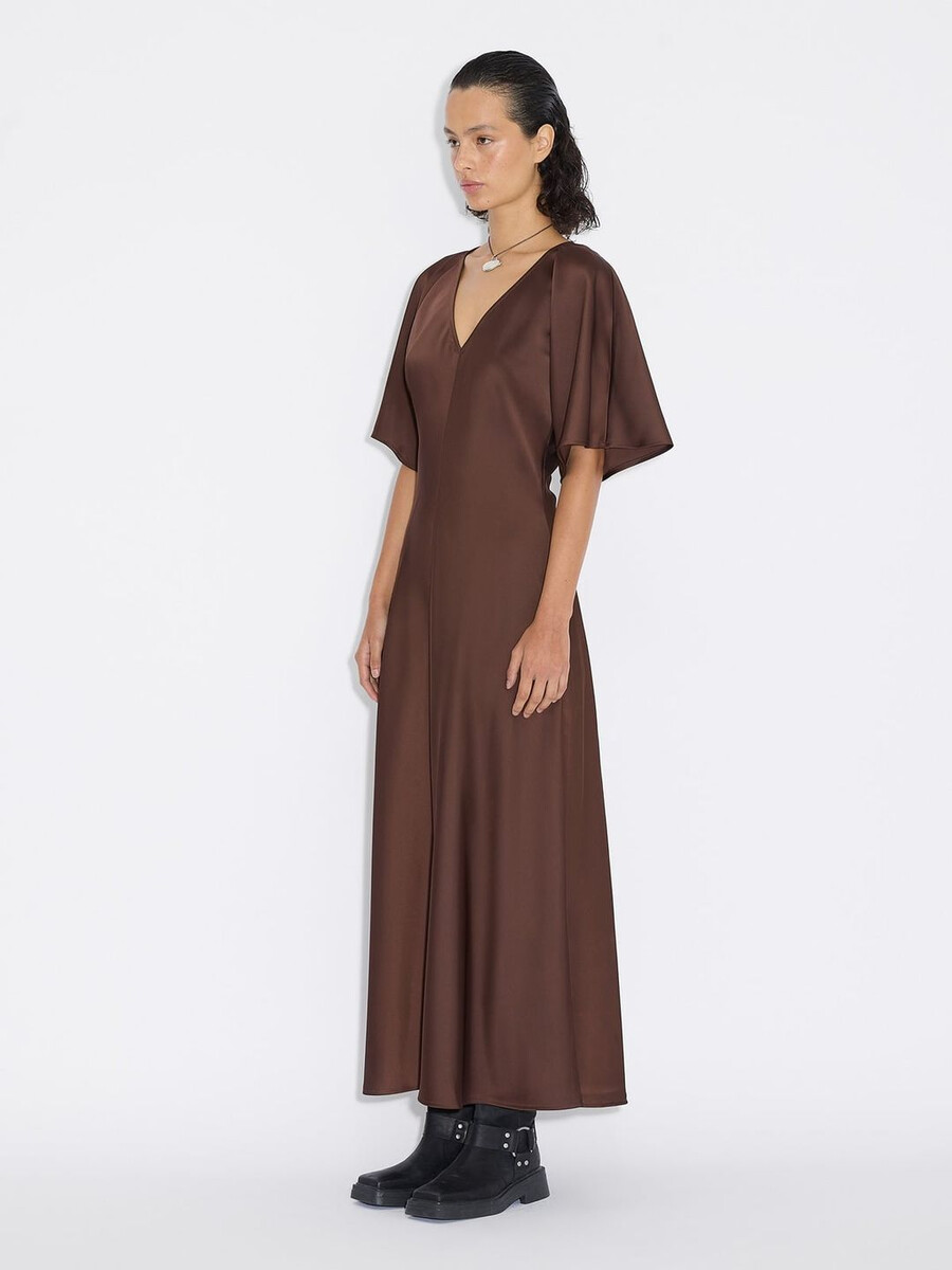 Our Rakel dress is an understated design suited to a range of occasions. Made from a shiny satin fabric, it has airy short sleeves, a v-neck, fitted waist and a midi-length hem.