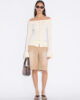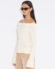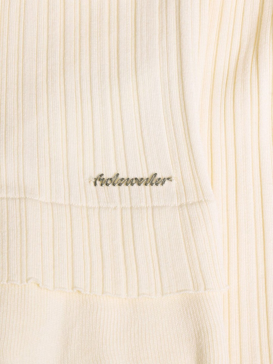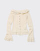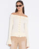A layered style, the Ripple cardigan is made from a ribbed-knit with the plain knit internal layer visible at the edges. It’s an off-shoulder silhouette with a buttoned front, long sleeves and a gleaming metal logo plaque at the front.